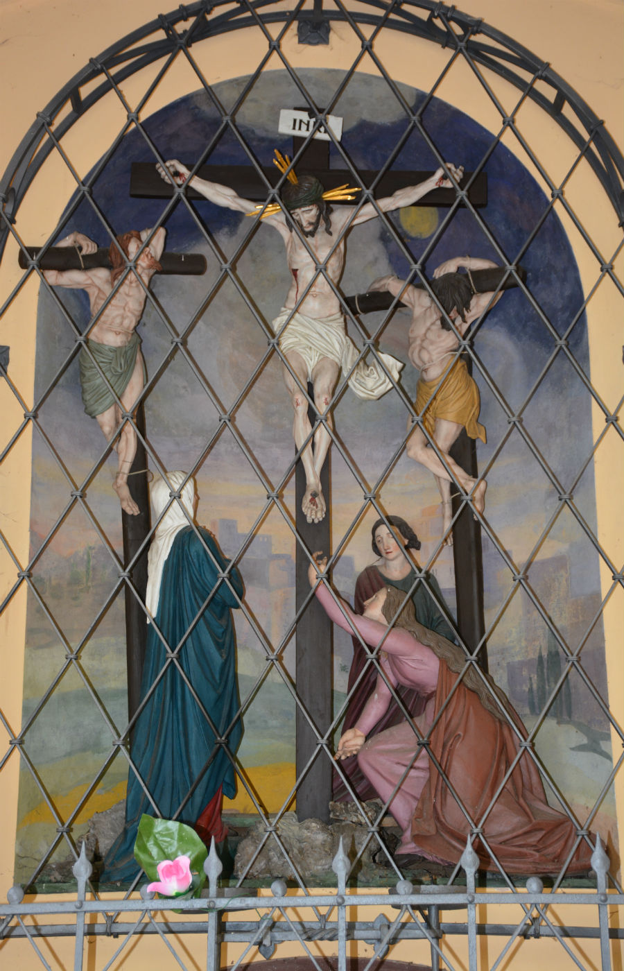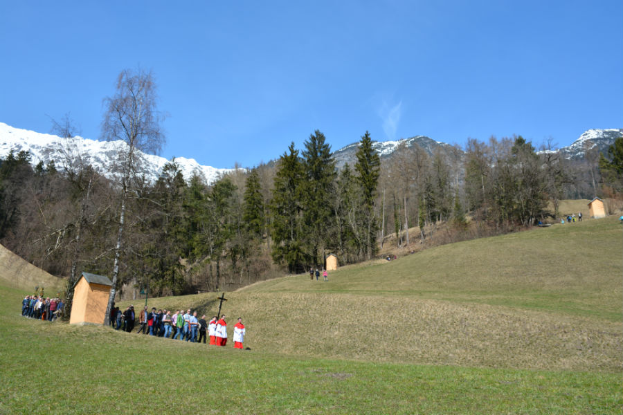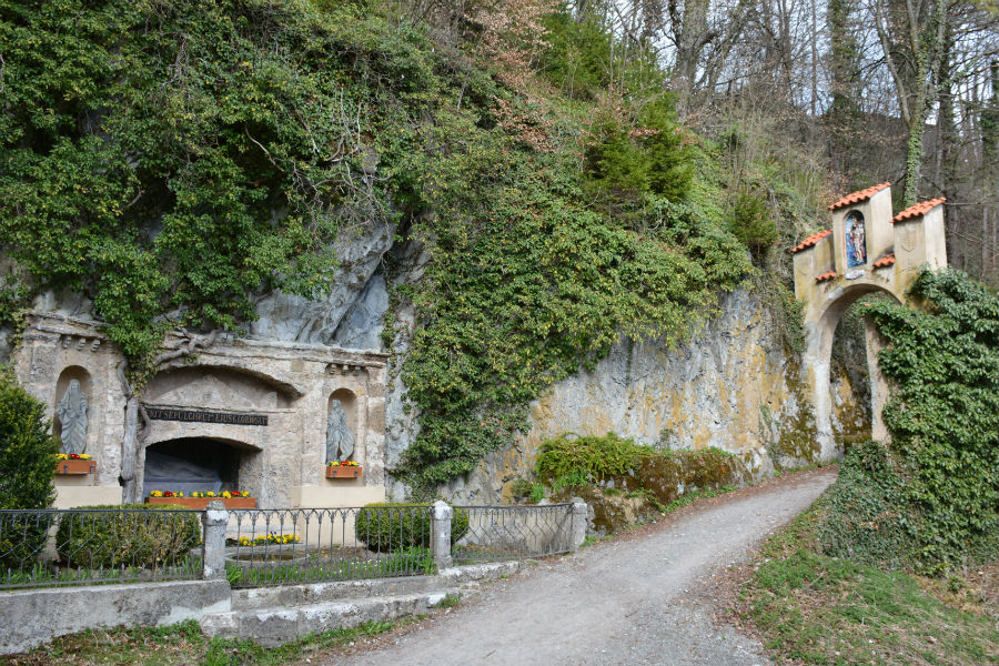 1872 beschlossen einige Mitglieder des Kirchenchores sieben Kapellen mit Kreuzweg-Darstellungen zu errichten. So entstand ein kulturlandschaftlich ansehnliches Ensemble aus Kapellen und einem abschließenden Kerker sowie einer auf einem dem Schlossberg vorgelagerten Hügel errichteten Kreuzkapelle. In dieser Kapelle wird eine Kreuzigungsszene mit Figuren von FRANZ PERNLOCHNER II. dargestellt.
