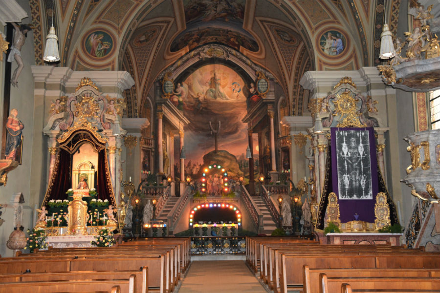 Karsamstag: Der Blätterbogen nimmt das Allerheiligste in der verschleierten zur Anbetung ausgesetzten Monstranz auf. Während der Osternachtsliturgie weicht die Trauer über das Leiden und Sterben Christi der Freude über seine Auferstehung. Nach den Worten: „Christus ist erstanden“ wird der Hintergrund beim Heiligen Grab aufgerollt. In der Grabnische verkündet der Engel die Osterbotschaft und am reich geschmückten Hochaltar zeigt sich der auferstandene Christus in der Darstellung von JOHANN GINER DEM ÄLTEREN.